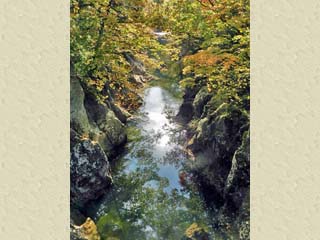 「セキレイ橋」から見る下流の方向。 橋から見る下流は、川の幅が狭まり、 峡谷の趣である。 写真をクリックすると拡大写真(450x600)が 表示されます。 |