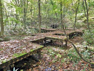 遊歩道から右下に、「八ッ橋」を見る。 階段や木道は、落葉に覆われる。
