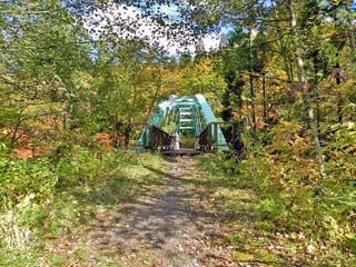支流に架かる短い「橋」を渡る。 写真中央下に明るく見えるのは、木々の合間から 漏れる「光」で、橋は、その上に写る。 |