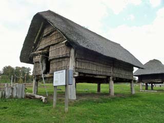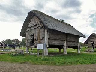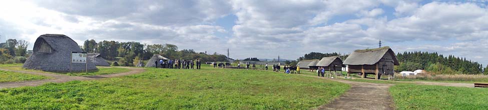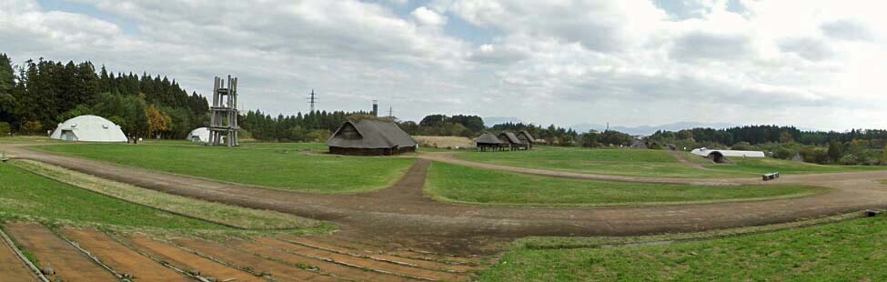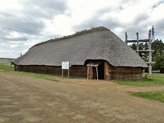 左手前に「北盛土」に捨てられた土器などが見学できる建物。その奥に3戸の「掘立柱建物」。中央付近に「大型竪穴住居」。