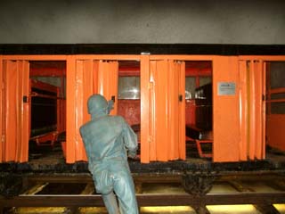 2011/10/27(13:32) 「斜坑人車」。 傾斜が急な「斜坑」で、人を運んでいた車両で、 写真の中間車両2~3両に先頭車と、後続車を 連結させ、4~5両の編成で運行していたと いう。 |
