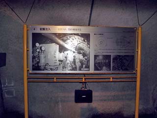 2011/10/27(14:21,14:24) 「体験坑道」内の説明板。 「坑道」内には、トンネルの掘り方や完成までの工程等を説明するパネルや、 各種データ(数値)の書かれた説明板が数多く置かれている。 |