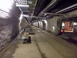 2011/10/27(13:51) 「ケーブルカー乗車口」への通路。 「体験坑道」へは、保守作業の出入りや資材運搬 のためにも利用されるというケーブルカー(青函 トンネル竜飛斜坑線)に乗り約8分、海面の下 140mの「体験坑道駅」へと運んでもらう。 なお、この先は別料金で、ガイドさんに案内され ながらの見学となる。 |