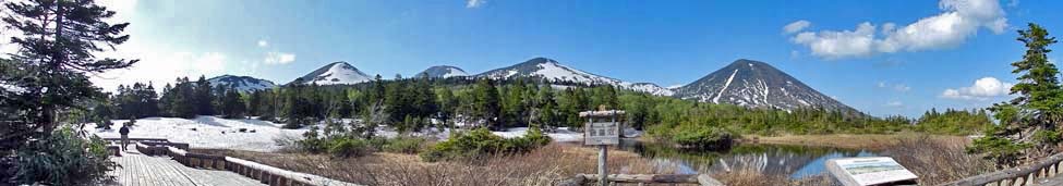 「睡蓮沼入口」と睡蓮沼から見る「八甲田連峰」。