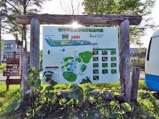 散策路の案内板。 「田代平湿原」の生成と植物群などについて書かれる。 写真をクリックすると案内板の説明「天然記念物」が 表示(800x600)されます。 |