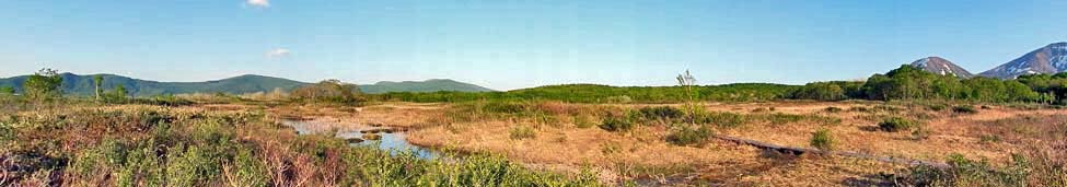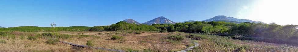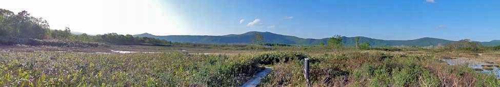 「中央ルート」と「南側ルート」の分岐点から見る北方向の景色。 湿原の奥の山は、柴森山(標高:715m)から石倉山(標高:891m)へと続く山々で、中央付近のピークが「七十森山(標高:886m)」。 |