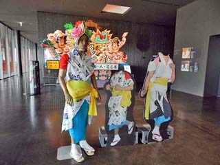 「記念撮影用顔出しパネル」と「ねぶた」の下絵コンクール入選作品。 どちらも「エントランス・ホール」から階段を上がった所にある。