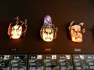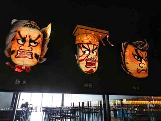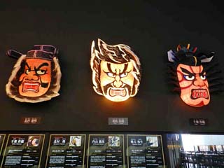 「15のねぶた面」。 現役の「ねぶた師」15名が制作した 「ねぶた面」が並ぶ。 左から、北村麻子、立田龍宝、北村春一の作品。