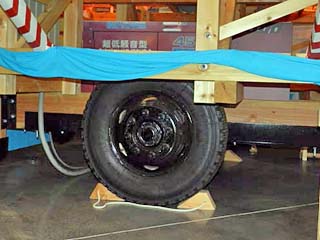 発電機の重さだけで約1.3㌧。総重量4㌧になる「ねぶた」を支えるのは、大型車用のタイヤと 車軸である。