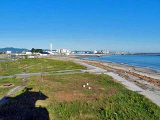 写真には、出力100万kwの石炭火力発電2基、 国内最大級という「相馬共同火力発電株式会社 新地発電所」の煙突が写る。