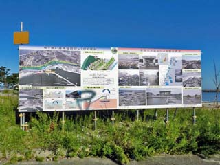 災害復旧事業」の記録碑。 東日本大震災で倒壊した防波堤は6年の歳月をかけ、 平成30年3月、堤長2,730mの防波堤を復旧。 左奥に写る灯台のような建物は、公衆トイレ。