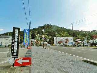 「飯盛山」参拝者用の駐車場と参道。 「会津飯盛山」は、JR磐越西線・只見線「会津若松駅」の東南東約2.4kmにある標高372mの山で、
