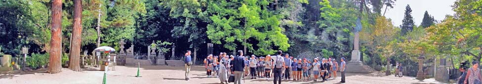 「白虎隊十九士の墓」前の広場。 広場では、小学生が集合させられ、説明を受けている所であった。 小学生達の右に立つ塔は、古代ローマ時代のポンペイから発掘された宮殿の石柱による「ローマ記念碑」で、 昭和3年(1928)に「ベニート・ムッソリーニ」から寄贈されたという。