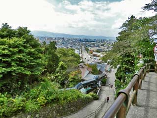 この写真下方には、急な石段を登る人の姿と、 石段に平行して造られた「スロープコンベア」が写る。 写真をクリックすると「スロープコンベア」と石段部分を 切り抜いた画像(600x450)が表示されます。 |
