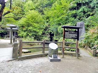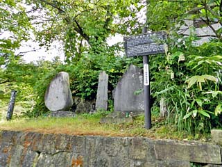 「水塚、花塚、茶釜塚」。 写真左から「茶釜塚」「水塚」「花塚」。 「花塚」には、「松平容保公」の歌が刻まれ、 北海道から九州までの各地で集められた 243種類の花が埋葬されたという。 |