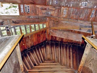 「さざえ堂」最頂部の太鼓橋から進行方向下を見る。 太鼓橋までの登りは右回りであったが、太鼓橋を渡ると、