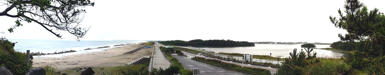 2010/9/23(15:53) 「鵜の尾岬」から見る南側の景色。 中央に真っ直ぐのびる「大洲松川浦ライン」の左側が、「太平洋(大洲海岸)」。右側が「松川浦(押切岬)」。 注:写真は、横が1,344ピクセルあります。写真直下にあるスクロールバーをご利用ください。 |
