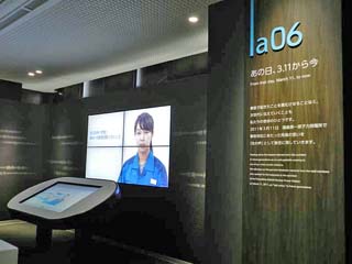 地震発生から原子力事故と事故後の対応などに ついての映像を視聴。 写真は、「シアターホール」を出たところにある 「福島第一事故の対応経過」のコーナーで、 震災発生から電源が復旧するまでの11日間の