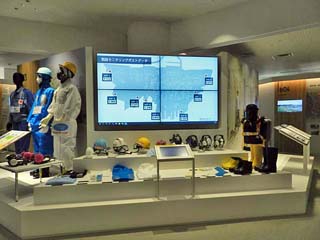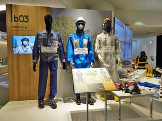 「労働環境改善」。 このコーナーでは、放射性物質による リスク低減等の取り組みを紹介。 写真は、左から、一般作業服、Green Zoneでの