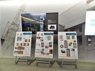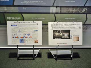 「中長期ロードマップの進捗状況」と 「原子炉格納容器内の堆積物の調査方法」。 写真のパネルでは、中長期ロードマップの 進捗状況と2号機における原子炉格納容器内の 堆積物の調査方法について解説されている。 |