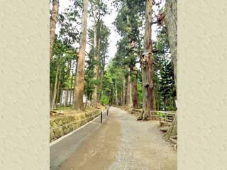 参道を奥(西)に進む。 参道の杉並木は、推定樹齢300~400年。 江戸時代、伊達藩によって植樹されたといわれる。 写真をクリックすると拡大写真(450x600)が 表示されます。 |
