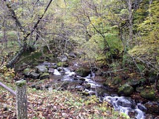 2011/10/25(8:38) 「二又沢」を渡る。 高炉にとって沢の水は、高炉に風を送る 「フイゴ」を稼働させる大切な動力源である。