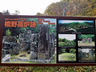 2011/10/25(8:37) 「橋野高炉跡」入口付近。 「橋野高炉跡」は、現存する日本最古の洋式高炉 跡であり、国の文化財史跡にも指定されている。 場所は、鉄の町「釜石」の北にある「鵜住居」 から、岩手県道35号釜石遠野線を西に約25km 走ったところにある。