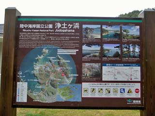 2011/10/25(10:51,10:52) 「浄土ヶ浜第一駐車場」の案内板。 どちらの写真もクリックすると、拡大画像が表示されます。 両方の写真をクリックし、表示される2つの画像を並べてみると「浄土ヶ浜」のイメージが 理解しやすいかと思います。 左の写真をクリックすると、案内板左の「航空写真」が拡大表示(700x450)されます。 右の写真をクリックすると、案内板右下の「散策ルート所要時間」が拡大表示(800x380)されます。