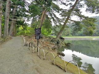 「州浜(すはま)」。 「大泉ヶ池」の東南隅にあり、海岸の砂州を 表現しているという。 写真をクリックすると「州浜」の案内板(600x450)が 表示されます。 |