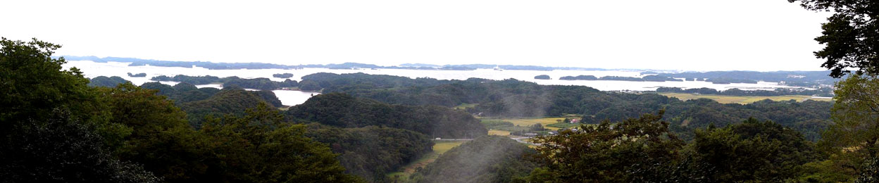 2010/9/24(7:23) 「壮観(大高森):標高105.8m」から見る景色。 写真、左に「松島湾」。右の端は「石巻湾」で、弓なりになった「野蒜海岸」が見えている。 また、ここからは「松島湾」を西の方向に見るため、夕陽で真っ赤に染まった「松島」を写す絶好のシャッターポイントとしても知られる。 注:写真は、横が2,016ピクセルあります。写真直下にあるスクロールバーをご利用ください。 |