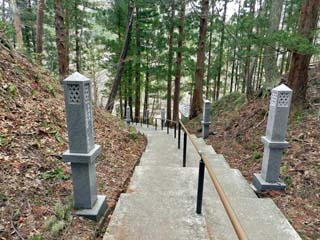 「大滝不動尊」から「秋保大滝」へと下りる 石段の左右には、「道しるべ形灯篭」が並ぶ。 |