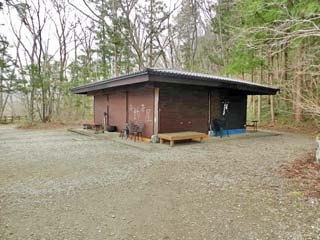 おやすみ処「不動庵」。 写真右の建物が、「不動庵」、奥は「駐車場」。 「大滝不動尊」と駐車場の間には、お土産物や