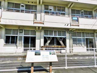 海岸からは約700m内陸に位置するのだが、平成23年(2011)東日本大震災の津波は、 校舎2階の床上約40cmにまで達した。
