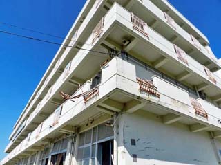 見ることができる。 写真をクリックすると入口頭上にある「倒壊した ベランダ壁と鉄柵」が表示(600x450)されます。 |