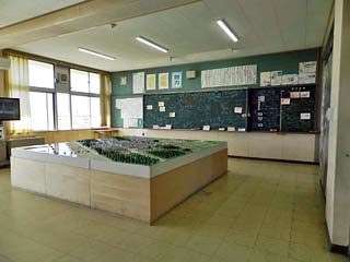 荒浜の歴史と文化、荒浜小学校の思い出 (元6年1組教室)。 写真は、震災前の「荒浜地区」を再現したジオラマ。 |
