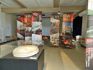 写真奥では、地震発生から校舎屋上の避難者 全員が救出されるまでの27時間をまとめた 記録映画(約17分)が上映されている。 |