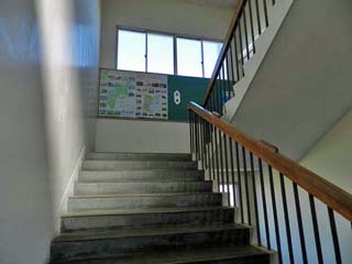 2019/10/16(10:35) 3階へと上がる 3階への階段踊り場には、6年生の卒業を 祝うために飾られていた風船の跡が残る。