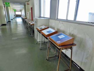 1階東(海)側の教室。 写真、左は「保健室」。右は「1年1組教室」。 いずれも教室の中には入れず、廊下から撮影。