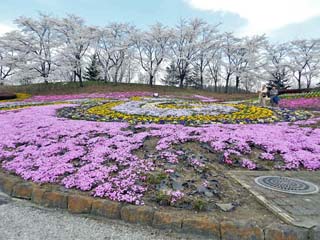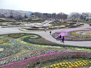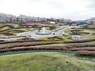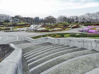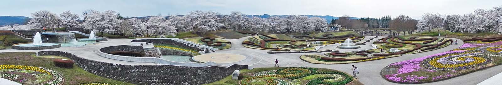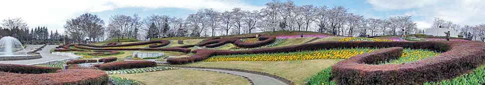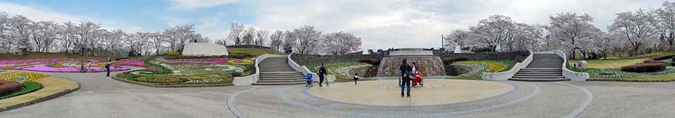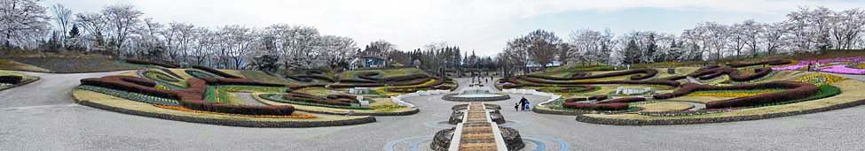 2018/4/11(11:37) 「彩のひろば」。 「彩のひろば」は、英語表記で「Flower Garden Area」。広さ7,000㎡(2,117坪)の大花壇である。 広場は、春はチューリップやパンジー、夏はマリーゴールドやサルビア等と、季節毎に10万株の花々で彩られる。 この日は、広場を取り囲む桜の花も満開であった。 上の写真は、広場北部の高台に設けられた「展望台」から撮影。 写真左に、「不忘(わすれず)の滝」。広場中央の「噴水」を右上方向に歩くと「時のひろば」がある。 注:写真は、横が1,600ピクセルあります。写真直下にあるスクロールバーをご利用ください。 また、このページは、「みちのく公園(南地区)」のページから派生する子ウインドであり、 直接このページに入られた方は、「みちのく公園(南地区)」のページもご覧下さい。 |