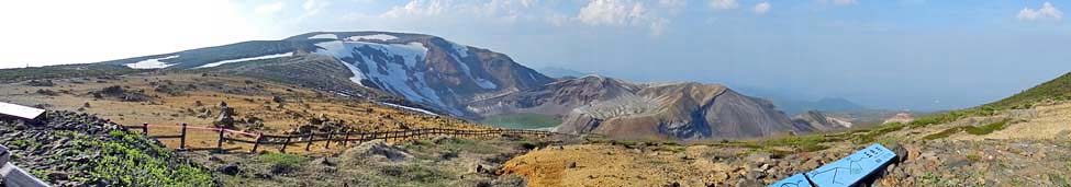 展望台から見る景色。 最高峰「熊野岳」から左に伸びる尾根が「馬の背」。「御釜」の右には、中央火口丘の「五色岳(標高:1,674m)」。
