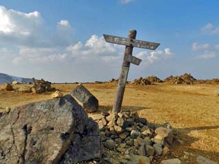 「県営蔵王レストハウス」脇から見る「熊野岳」。 標識には、「馬の背・お釜・刈田岳」の文字と 右方向への矢印が書かれる。 |