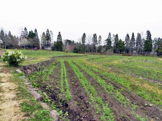 2018/4/11(9:59) 「ふるさと村」に向かう。 写真の木立の中に「クリスマスローズの丘」がある。 |