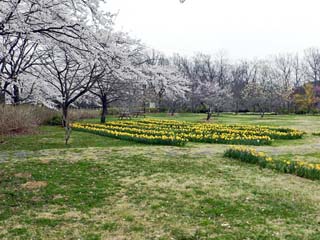 2018/4/11(10:33,10:35) 「花木園」。 春は、梅や石楠花。夏は、紫陽花。秋には、コスモスの花が咲くという。 この日は、「水仙」の黄色い花が咲き、周囲は満開の桜であった。 左の写真をクリックすると「花木園」の案内マップ(600x450)が表示されます。 右の写真をクリックすると拡大写真(600x450)が表示されます。 |