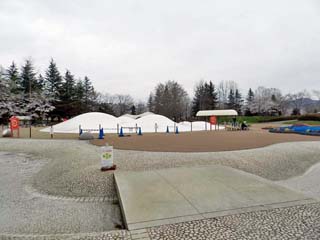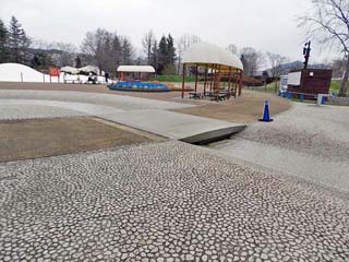2018/4/11(10:55,10:55) 「わらすこひろば」。 「わらすこ」とは、子供のこと。 広場には、「ジャンピングドーナッツ」「ステッピング土偶」「フローティング土偶」 「ターザンロープ」「足こぎカート」等、縄文をイメージしたという子供の遊具を揃え、 雨や雪の日でも、「ちびっこドーム」の大きなボールプールで遊ぶことができる。 左の写真、中央に「ジャンピングドーナッツ」。右の写真は、「じゃぶじゃぶ池(噴水&水遊び)」。 左の写真をクリックすると「わらすこ広場」の案内マップ(600x450)が表示されます。 |