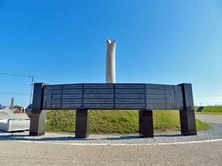 左の写真、メモリアル公園のメインゾーンとなる「祈りの広場」に立つ「芽生えの塔」の高さは、 この地を襲った津波の高さと同じ、8.4m。