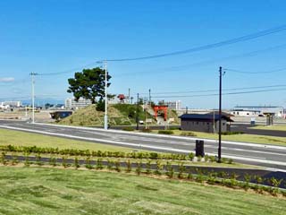 北の丘から見る「日和山」。 「日和山(ひよりやま)」の標高は、6.3m。 大正9年(1920)、「閖上漁港」への船の出入りを