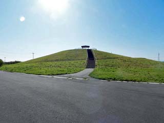「避難丘」。 高さ8mの丘には、階段の他、螺旋状に登る バリアフリーの道が設けられ、車椅子でも 登ることができる。 |