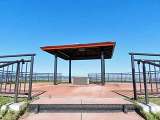 「防災四阿」。 「避難丘」の上に立つ「四阿(あずまや)」に 設けられたテーブルの下には、津波に備えた、 避難用のテントや脚立が納められ、避難した人達の