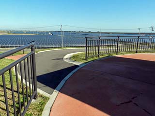 2019/10/16(9:00) 「避難丘」から見る東側の景色。 公園は西側を除き、太陽光発電のパネルに囲まれる。