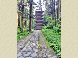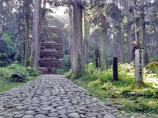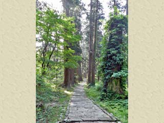 2014/5/30(7:20) 「爺杉」と「五重塔」の間の参道。 この場所は、参道から外れた「五重塔」の敷地内にある 石畳の道である。 写真をクリックすると「羽黒山五重塔」の 案内板(800x450)が表示されます。 |